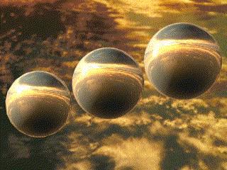 Three spheres with a gold metallic material applied,reflection